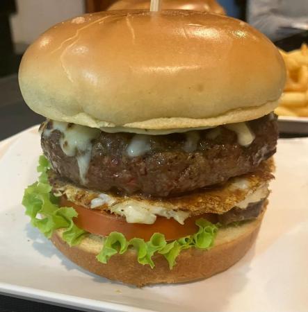 Pão brioche, blend de peito bovino 150g, ovo, bacon, mussarela, maçaricada, alface, tomate e maionese aido
