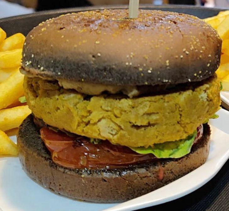 Pão australiano, hambúrguer de grão de bico 150g, picles de maçã artesanal, queijo de castanha de caju, tomate confit e rúcula